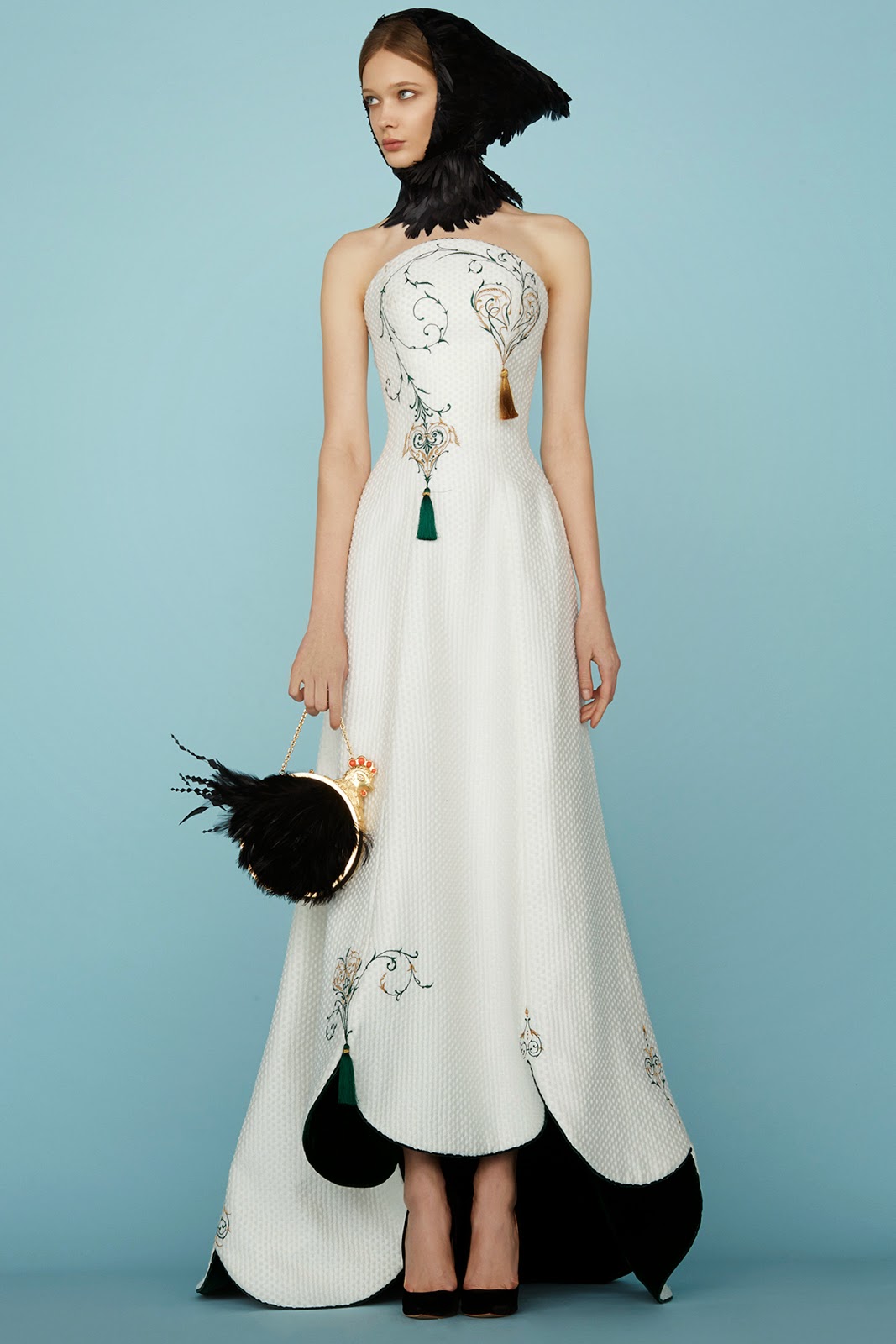 In a fabric story of tulle, satin and silk, the collection offered bell shaped gowns, capes, bolero inspired tops, bustier dress and jumpsuit .Botanical motifs and stripes and colours like blue, baby pink, black and white created a playful yet elegant couture story.(Image Credit:style.com)